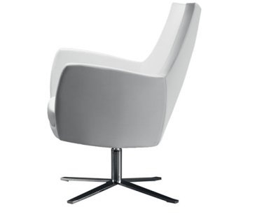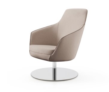 Modern lounge armchair with metal swivel base, available chromed or black colour. One-piece shell with internal steel frame fully padded with cold-cured PU foam upholstered in fabric, leather or eco-leather.Suitable for home, contract, naval use. Ideal for restaurant, bar, b&b, hotel, reception, cafès, meeting room or waiting room. Fireproof internal padding according to the following regulations: Class 1IM, French class M4, California Bulletin 117:2013.