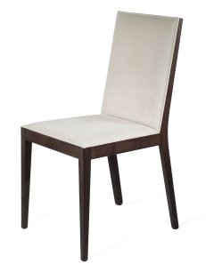 Modern chari made in solid beech or ash wood, available in a choice of finishes. Plywood backrest and pressed wood seat padded with flexible PU foam, upholstered in different coverings: fabric, eco-leather or leather. Ideal for home use. Minimum order quantities apply for this chair.